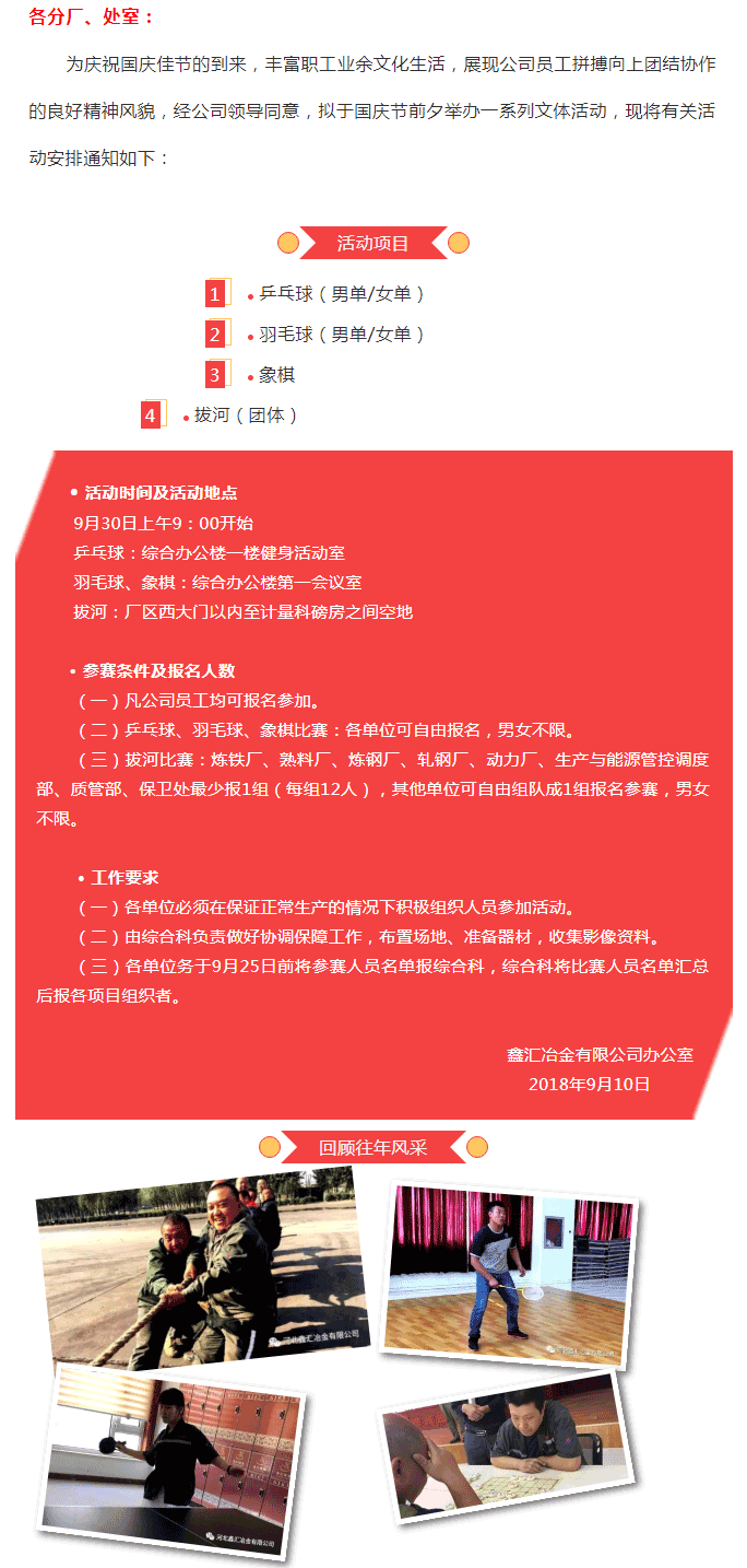 新聞摘要:鑫匯公司關于舉辦國慶節文體活動的通知